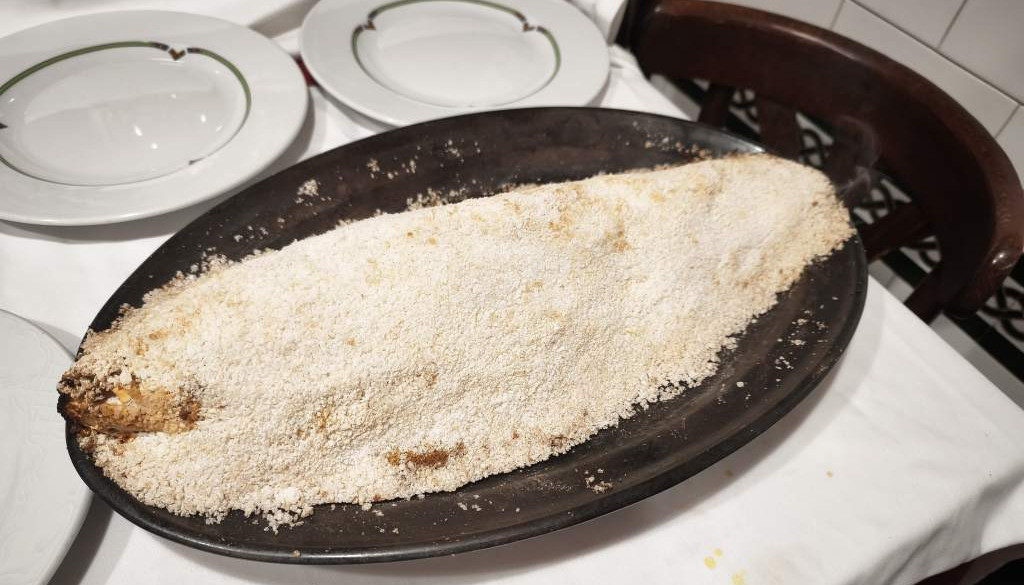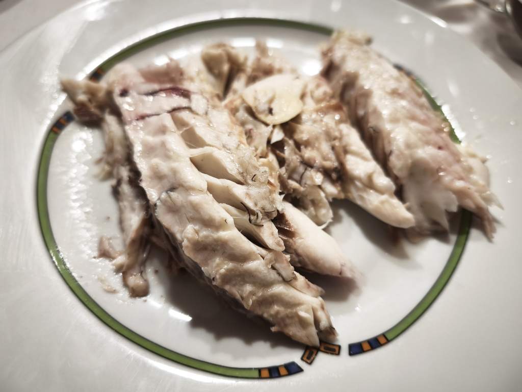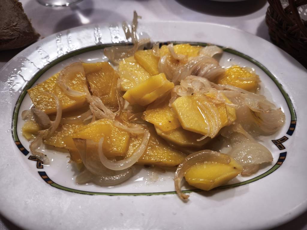 Hacía tiempo que no tomaba lubina a la sal, así que al verlo en la carta nos fuimos a por ella. Fantástica lubina, de 1,2kgs, preparada en su punto perfecto de jugosidad. Se acompaña de unas patatas panadera.