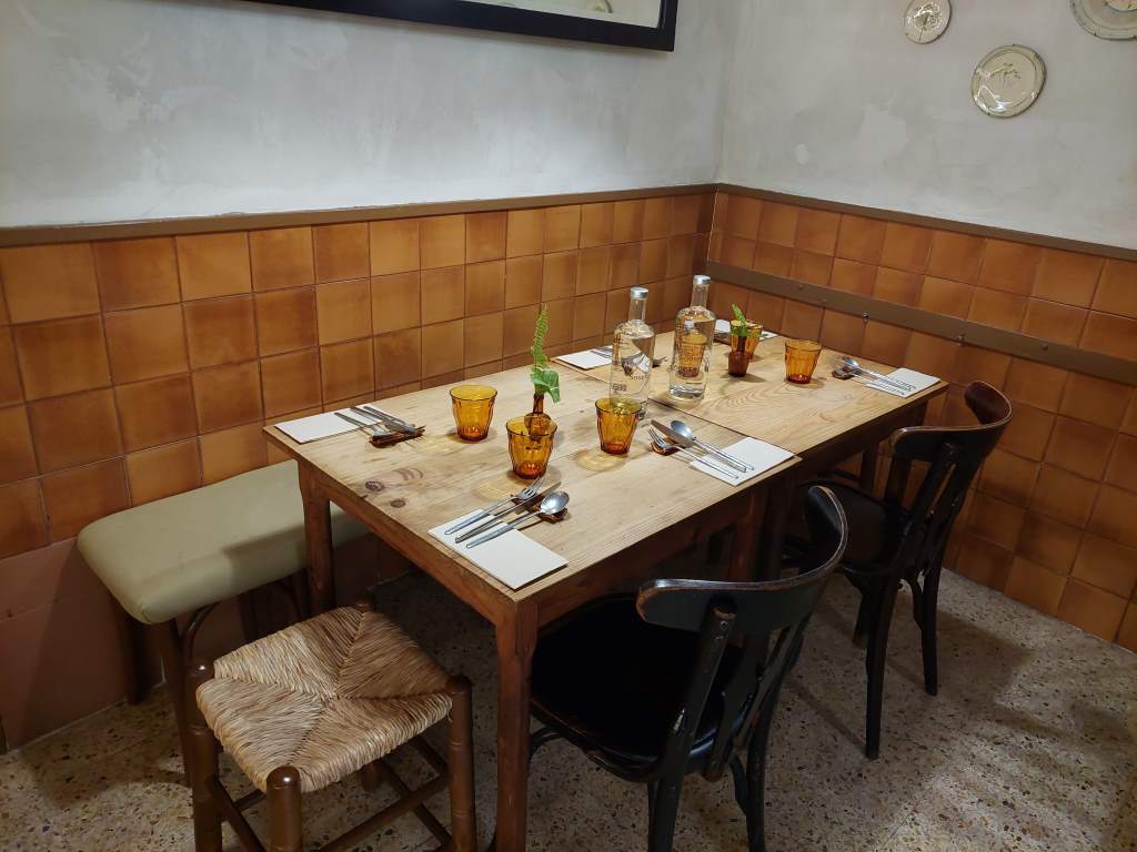 ¿Y en qué consiste su propuesta? Ofrecen un menú degustación por 32€, cambian el menú cada principio de mes, con agua filtrada y una ración de pan minúscula, lo que te lleva a pedir al menos otra más (3,5€). En cuanto al restaurante en sí, fue una taberna popular en el barrio, Mercè Vins (aún se conserva un cartel con el nombre) y, en esa moda actual de mantener antiguos bares tal como eran, en plan “vintage”, te hace comer en un comedor algo destartalado, con azulejos viejos y rotos, sillas viejas, etc. Debe ser que me hago mayor, pero creo que la sala hay que cuidarla un poco cuando se está hablando de tickets medios de 35/40€ pp.