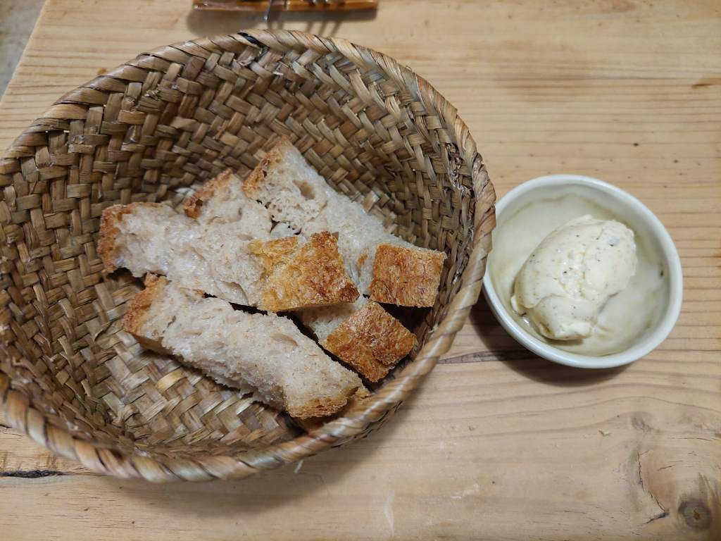 Comienza el menú con Mantequilla, “oruga” y pan hechos en casa. La salsa oruga es una elaboración de origen medieval hecha a base de hojas brásicas (mostaza, rúcula…), vinagre, especias, miel y frutos secos. En la época, se utilizaba como acompañamiento de proteínas animales (carne o pescado).