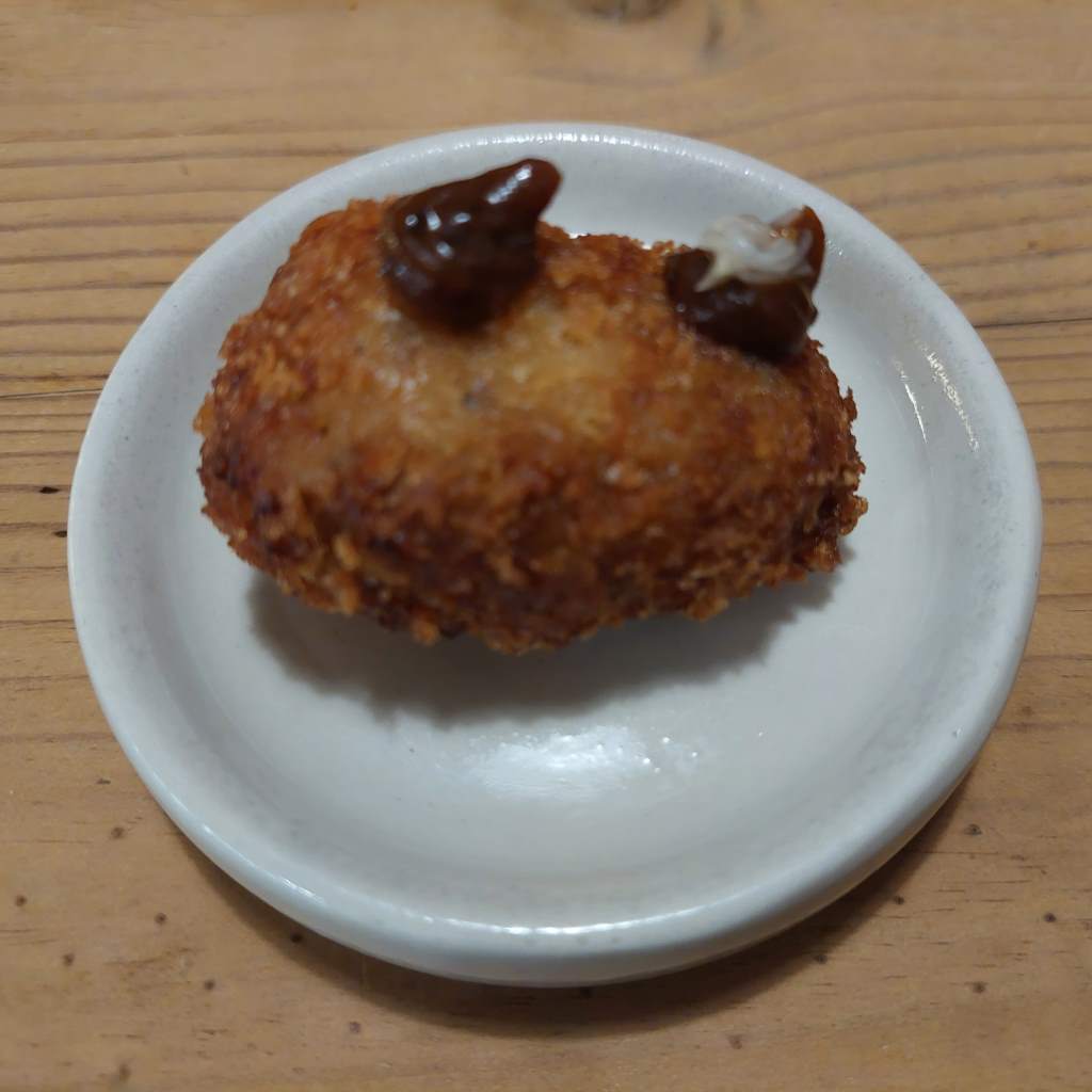 Croqueta de pollo a la catalana con piñones y ciruela. Bien