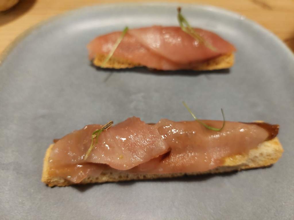Coca de bonito marinada, hinojo marino y praline de almendra