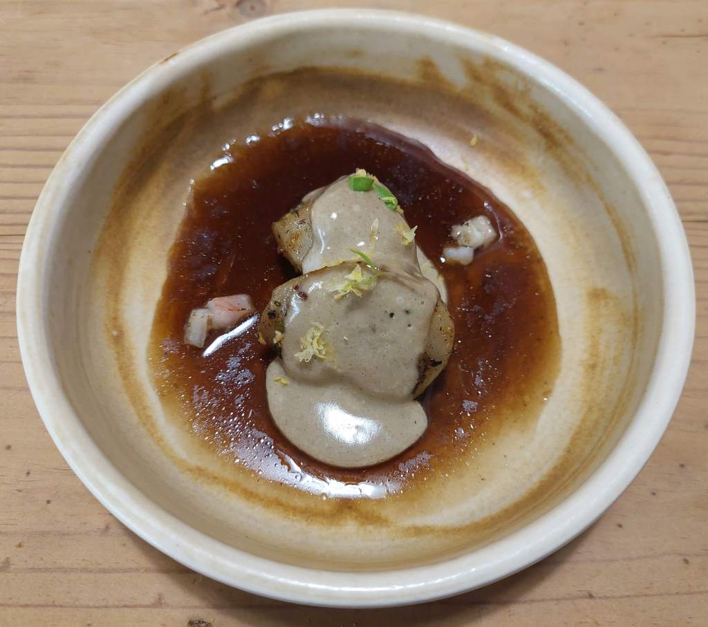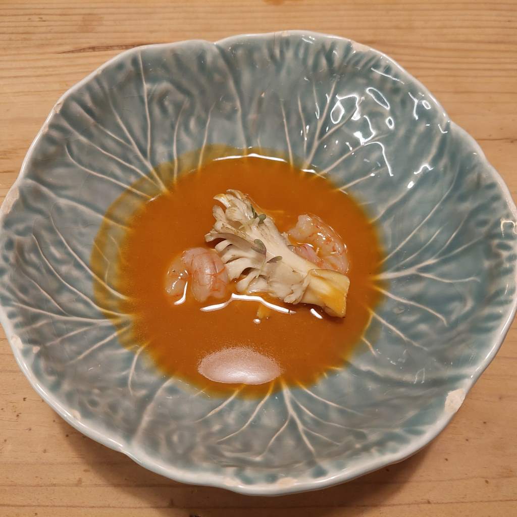 Seta de cardo, romesquet y gamba roja. Nos explicaron esta seta como una seta de castaño, que no conocía y por lo que he leído “es una seta autóctona catalana que se puede encontrar en la región del Montseny y que se caracteriza por su textura y forma, parecida a la de una flor. Se denomina así por crecer junto a los castaños, pero el nombre que más la ha popularizado por todo el mundo es el japonés Maitake”. Fue un plato sabrosísimo. El mejor del menú para mí.