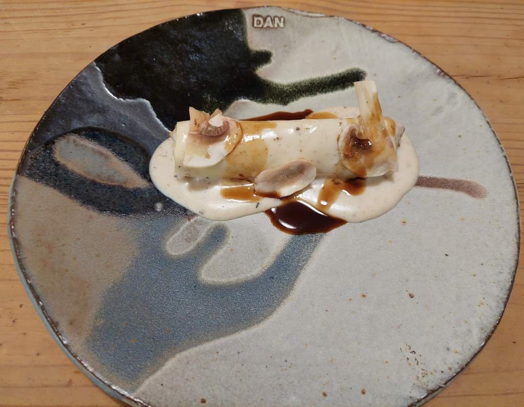 Topinambur con una holandesa de trompeta picada de avellanas y anguila ahumada