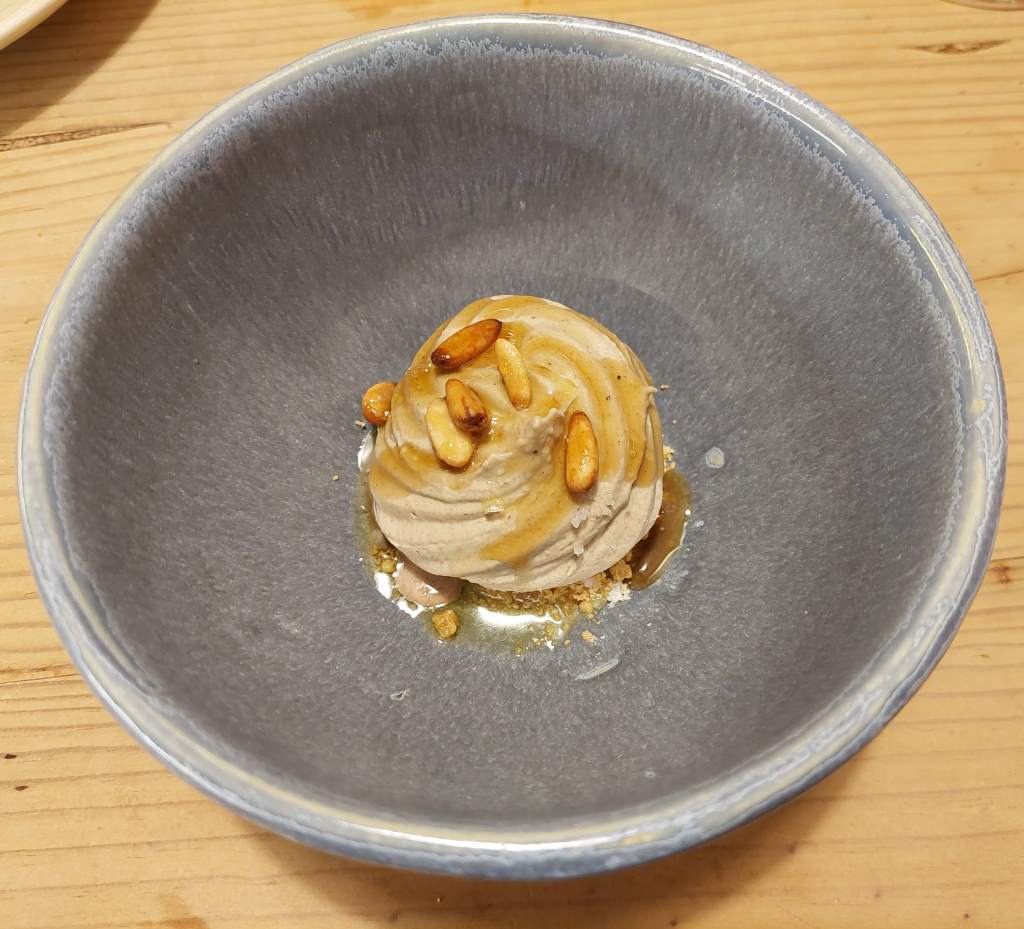 Con el postre daban dos opciones a elegir una, así que elegimos las dos para probarlas: Setas, algarroba y pino. Tenía un sabor peculiar, no para todos los gustos. A mí me gustó.