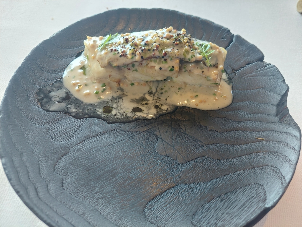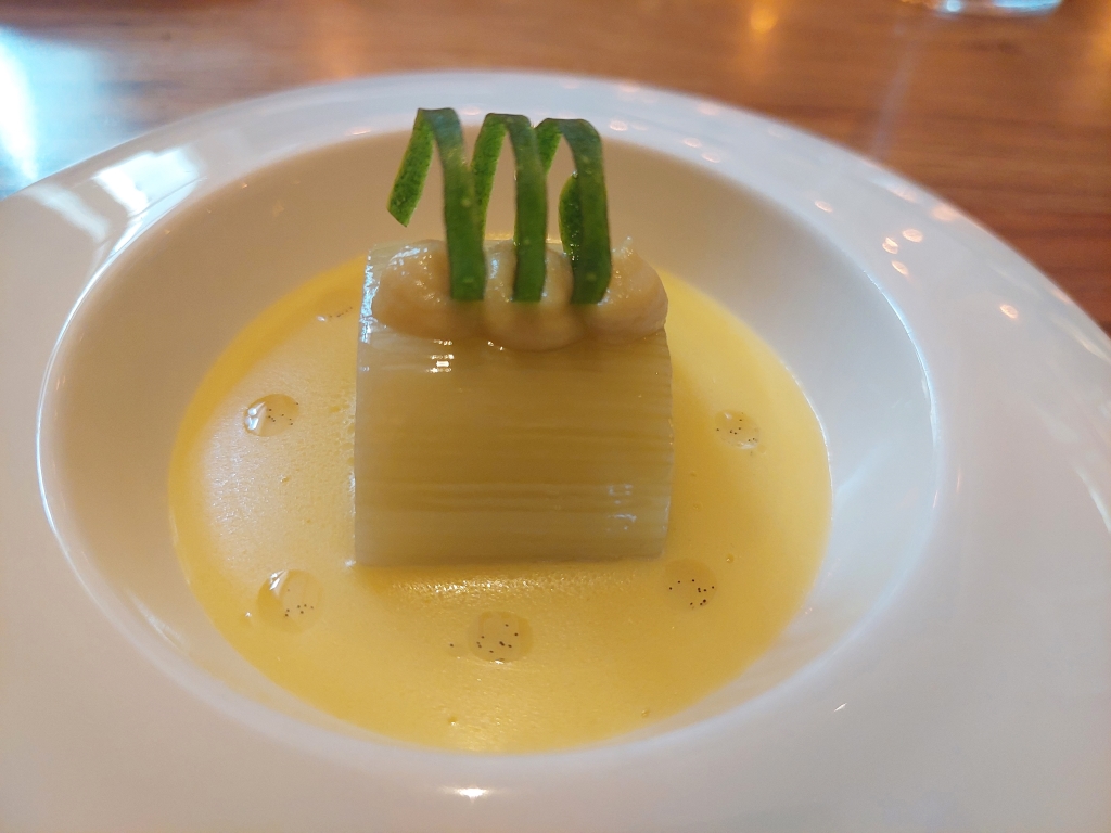 8 – FARALÁ (Granada): Puerro y Beurre Blanc. Quieren con este plato dar protagonismo a una verdura que suele ir en cremas o guarniciones, y han querido ponerlo como elemento principal. Cocinado a baja temperatura, debajo lleva un praliné de anacardos y la salsa beurre blanc con una esencia de vainilla y en la parte superior viene acompañado de una purrusalda y un cilindro de caramelo de mostaza verde. Maravilloso.
