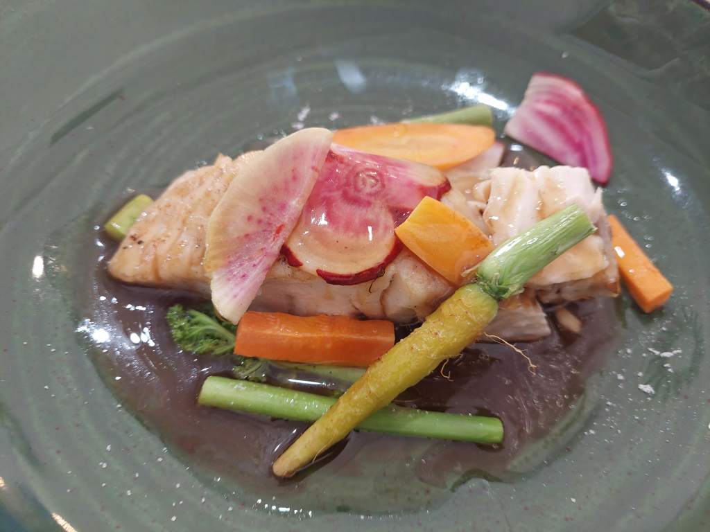 La corvina cocinada a la plancha y confitada, “majao” como un praliné, verduritas de Navazo de Sanlúcar al dente y consomé de galeras al Amontillado