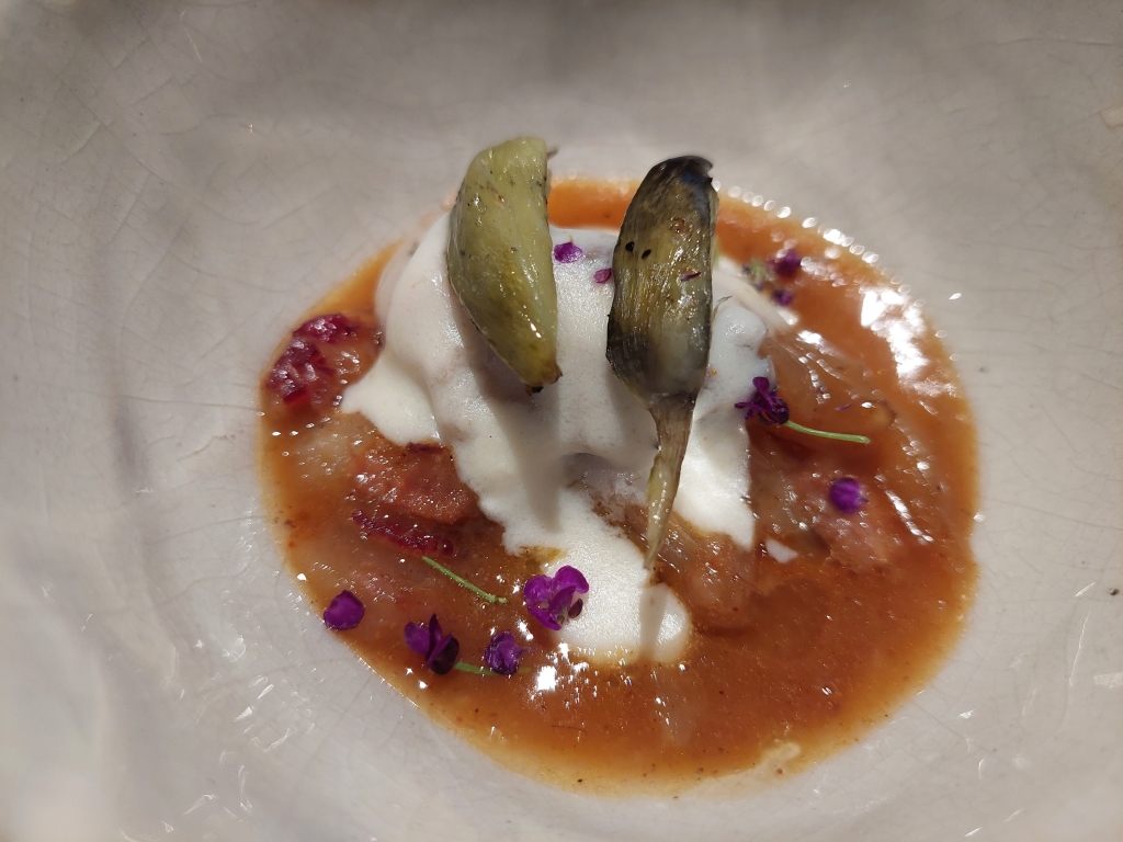 12. Iván Cerdeño: tomates asados en diferentes texturas, almendras y sopa de hierbas. Un dos estrellas de libro.