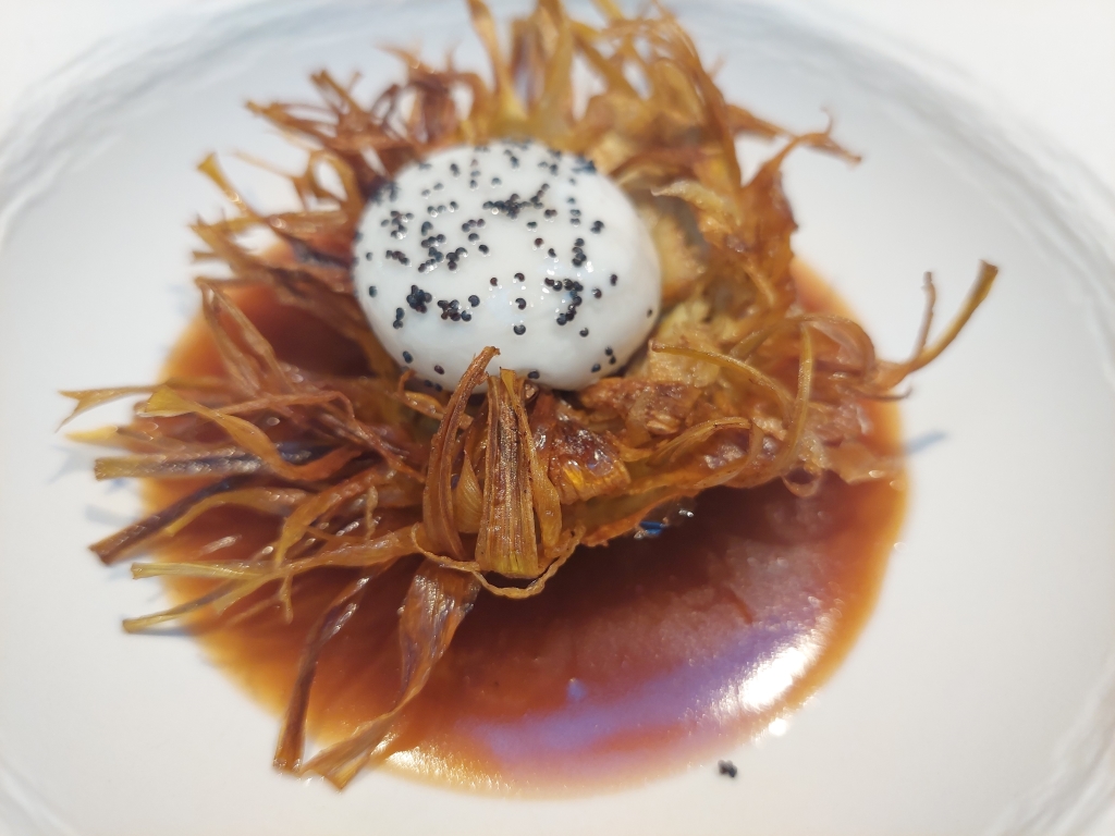 11. Omeraki (Madrid): alcachofa frita con salsa de jamón ibérico y burrata líquida. Un plato para volverte loco.