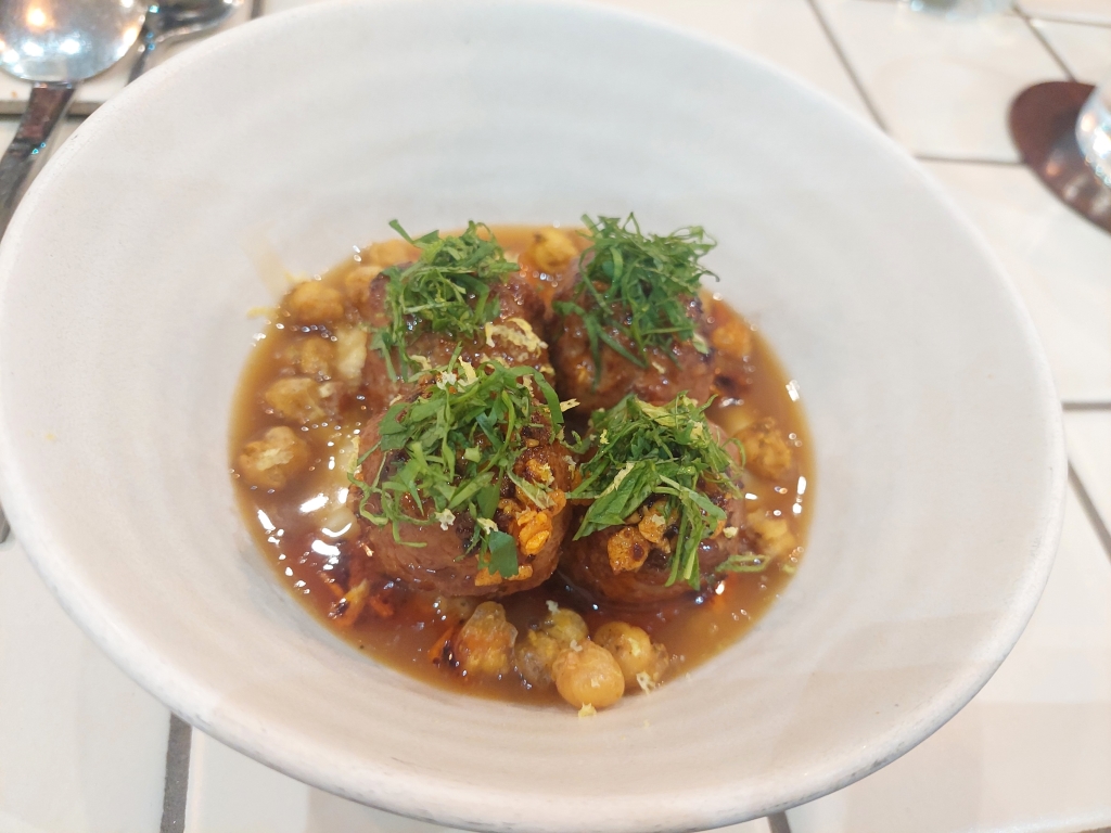 6 – LA LLORERÍA (Centro, Madrid): Albóndigas de pierna de cordero recental, maridadas 24 horas en shio koji, un fermento de arroz que se usa para elaborar el sake. Lo presentan con una base de plátano asado, un caldo de la cocción del cordero y lo terminan con garbanzos fritos, cilantro y hierbabuena.