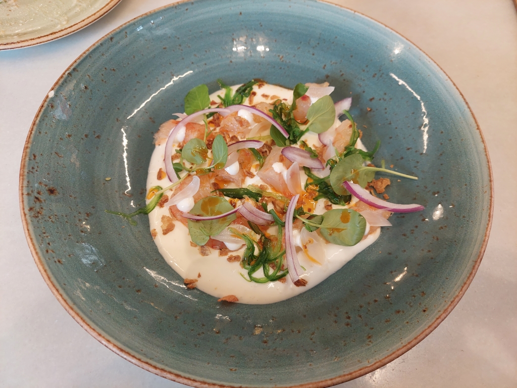 3 – HOYUELA (Maliaño, Cantabria): Gambón marinado sobre gazpachuelo de leche de tigre y aceite anticuchero.
