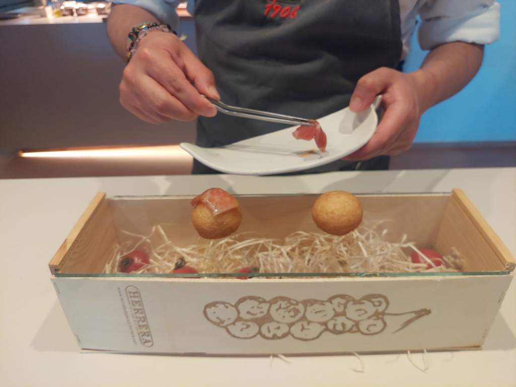 Ximo relleno de ventresca de atún rojo, macerada siete días y cubierta de tomate en polvo, sal y azúcar. Va acompañado de una salsa hecha con recortes de atún y jugo de pimientos asados, rematada con yema de huevo. Este pase se toma en una barra junto a la cocina abierta.