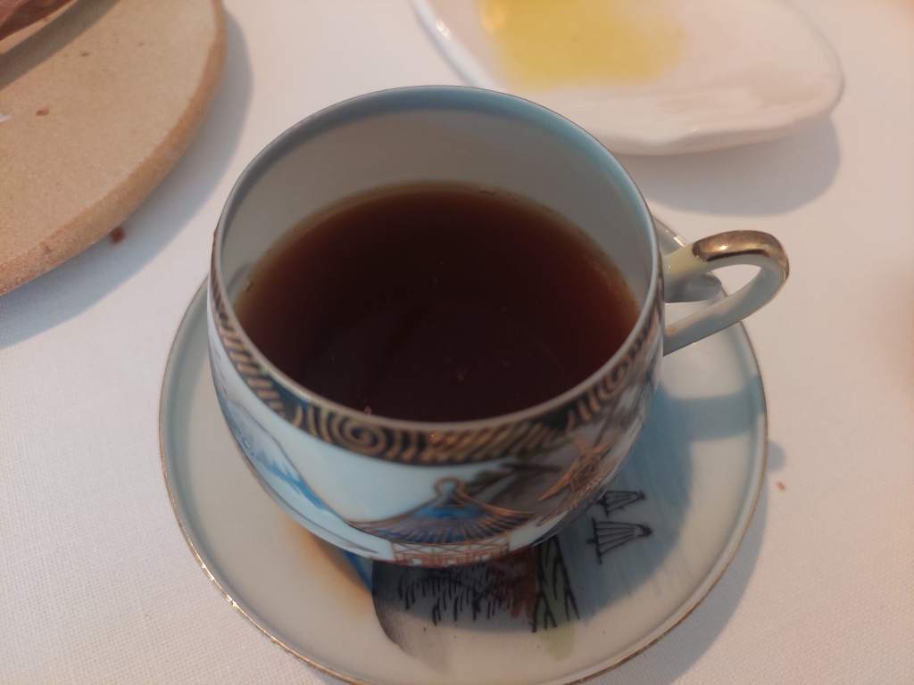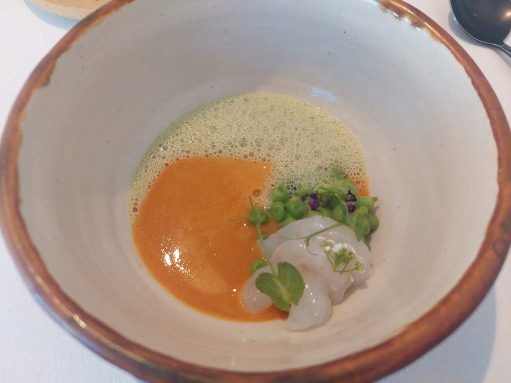 El primer plato fue guisantes lágrimas con cuajada hecha a partir de las vainas, junto con quisquillas curadas en agua de mar. La terminación incluye una sopa elaborada con cabezas y recortes de quisquilla y ras el hanout, dando un toque exótico muy bien integrado.