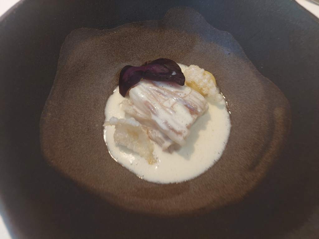 El otro plato fuera del menú que añadimos fue la raya en beurre blanc, uno de los clásicos de la casa, servida con gnocchis caseros de limón y un crujiente hecho con el colágeno de la raya. Un platazo.