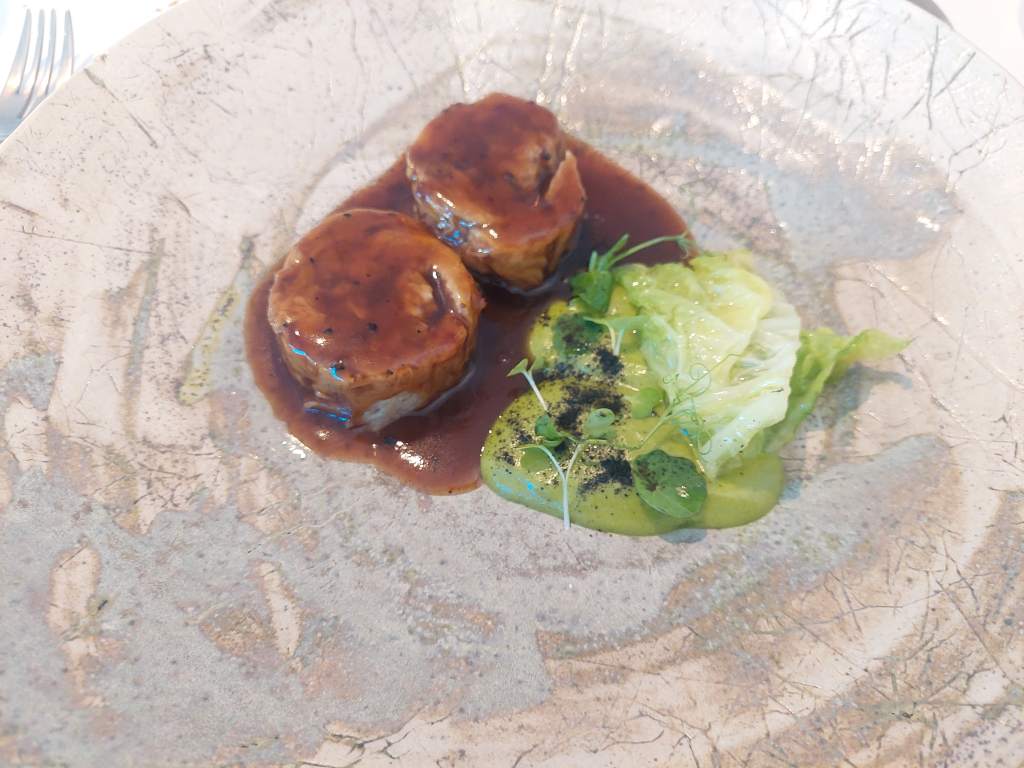 Le siguió el cordero relleno de verduras, acompañado de puré de col y una salsa de carne con trufa y anís. Un plato contundente pero equilibrado.