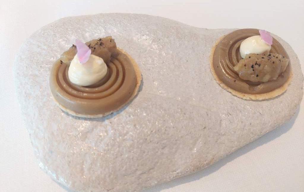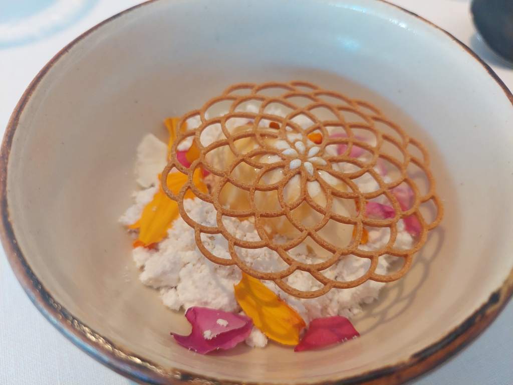 Como cierre, un postre de miel Mos de Bresca y almendra marcona, seguido de dos tipos de petit fours para acompañar con el café.