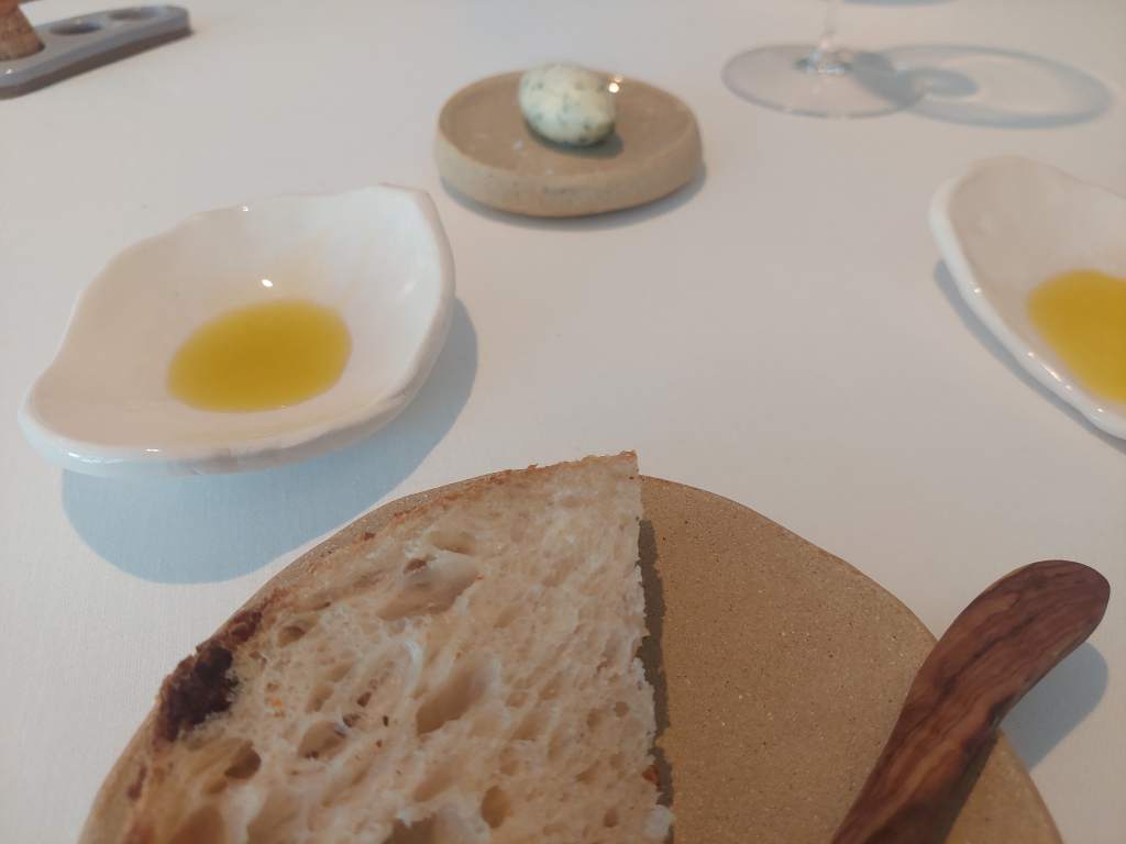 Los panes, elaborados con masa madre (blanco y de avena), vienen acompañados de mantequilla con hierbas aromáticas y ajo, además de un aceite de oliva virgen extra procedente de una finca cercana en Sant Mateu, cultivado con la variedad aceituna morruda , especialmente aromática.