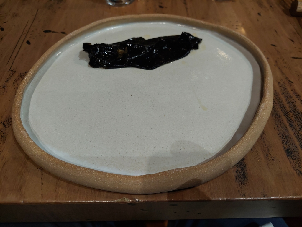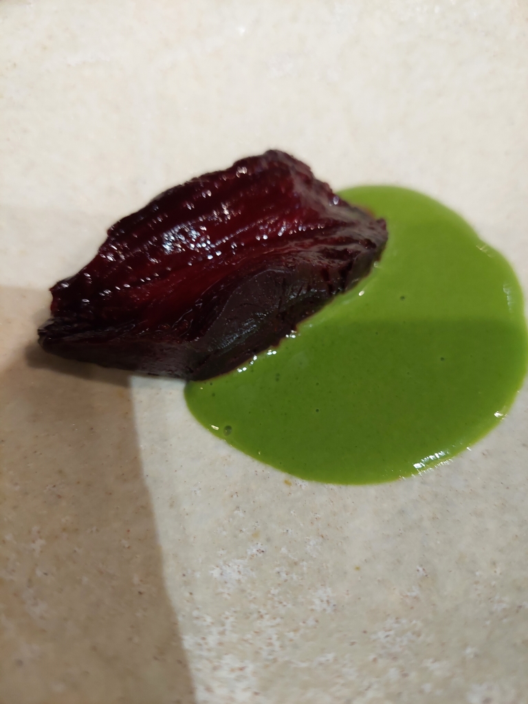 Remolacha con salsa de codium. El sabor terruno de la remolacha con el sabor a mar del alga. Irrepetible.