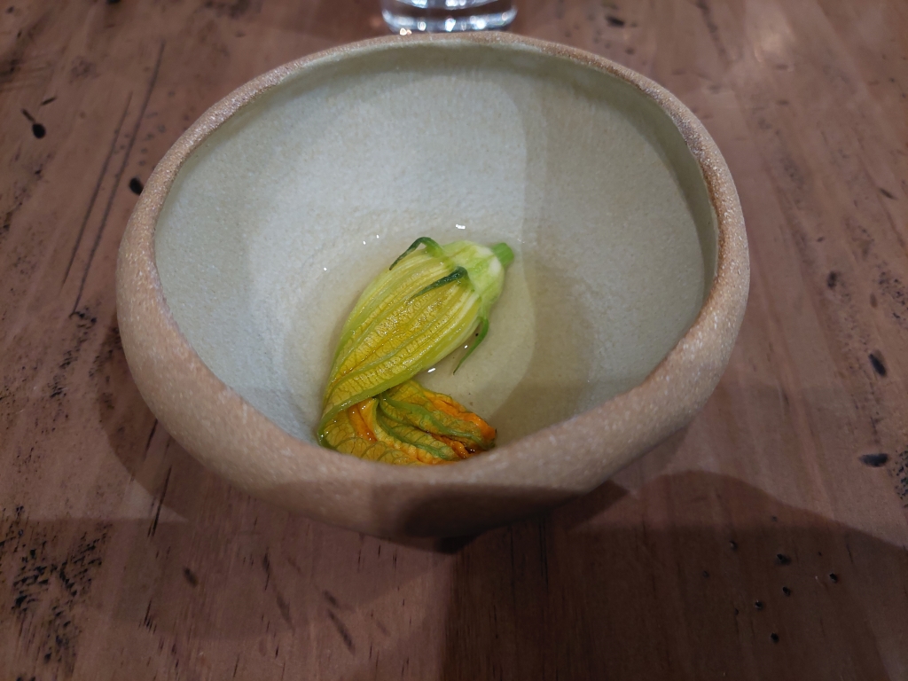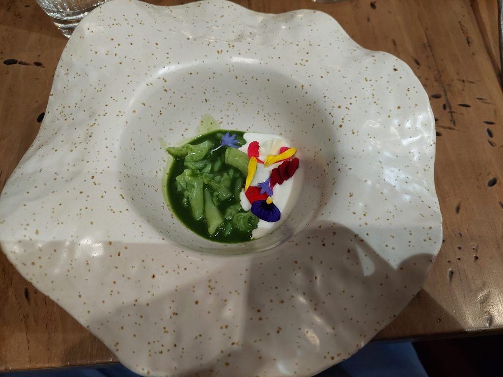 Callos de bacalao con mantequilla de oveia y flores. Otro de los platazos del menú.