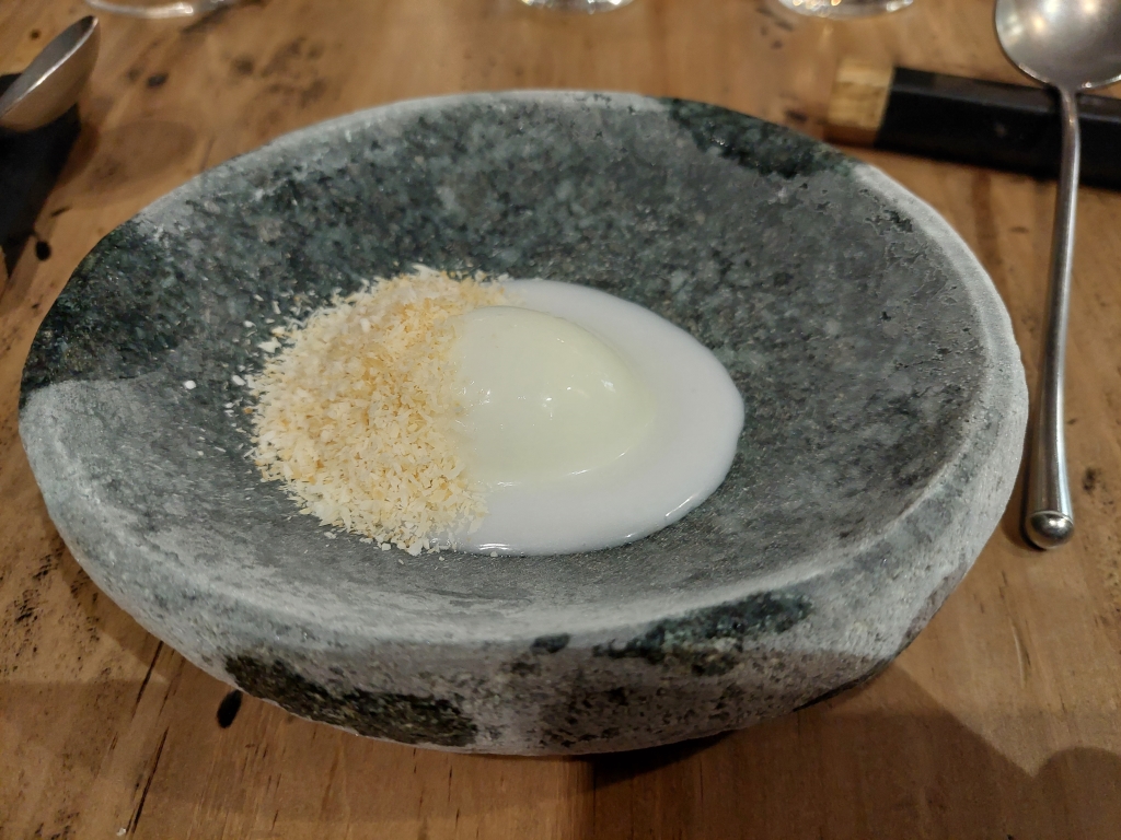 Y el último postre, el remate de un extraordinario menú, Huevo y coco.