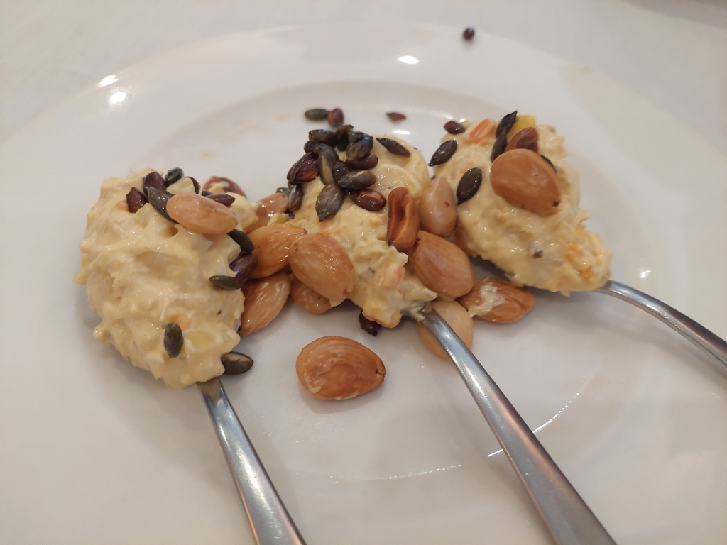 Para ir sobre seguro nos dejamos aconsejar y nos recomendó sus platos más celebrados: comenzamos con un aperitivo de la casa, una ensaladilla con almendras y pipas de calabaza tostadas,que presentan en cucharas, muy sabroso.