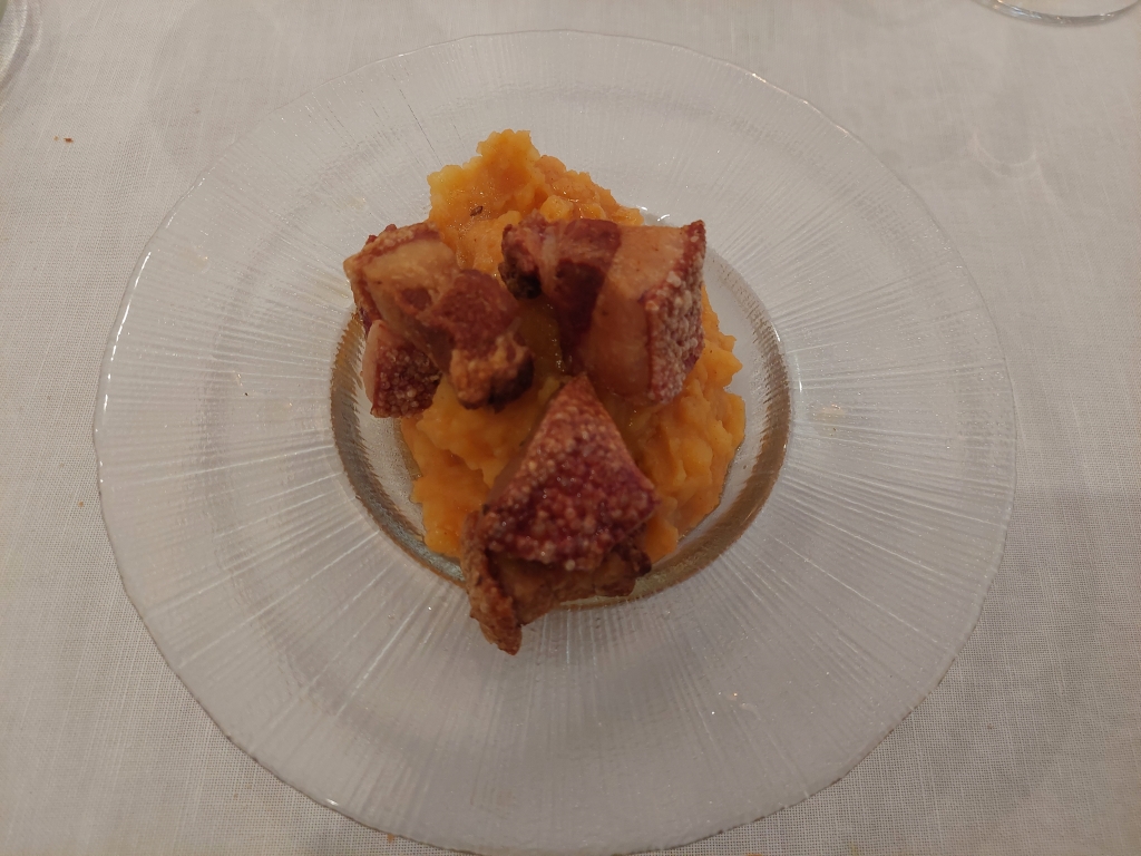 Comenzamos con unas patatas revolconas, estupendas, con un torrezno de los mejores que he comido en los últimos años, tanto por la proporción de carne y grasa como la fritura del mismo. Seguimos con un guiso de setas de cardo con un sabor extraordinario. Volvería sin duda solo por este plato de setas.