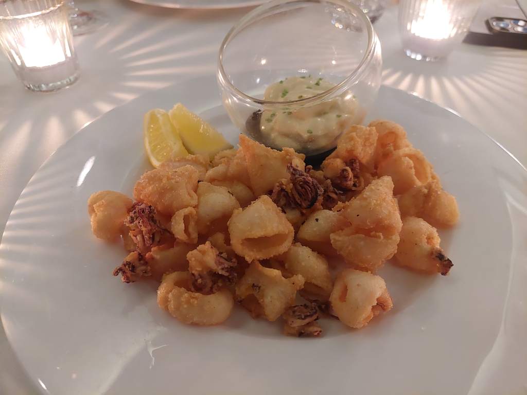Rabas de chipirón con mahonesa de chile. Perfecta la textura del calamar.