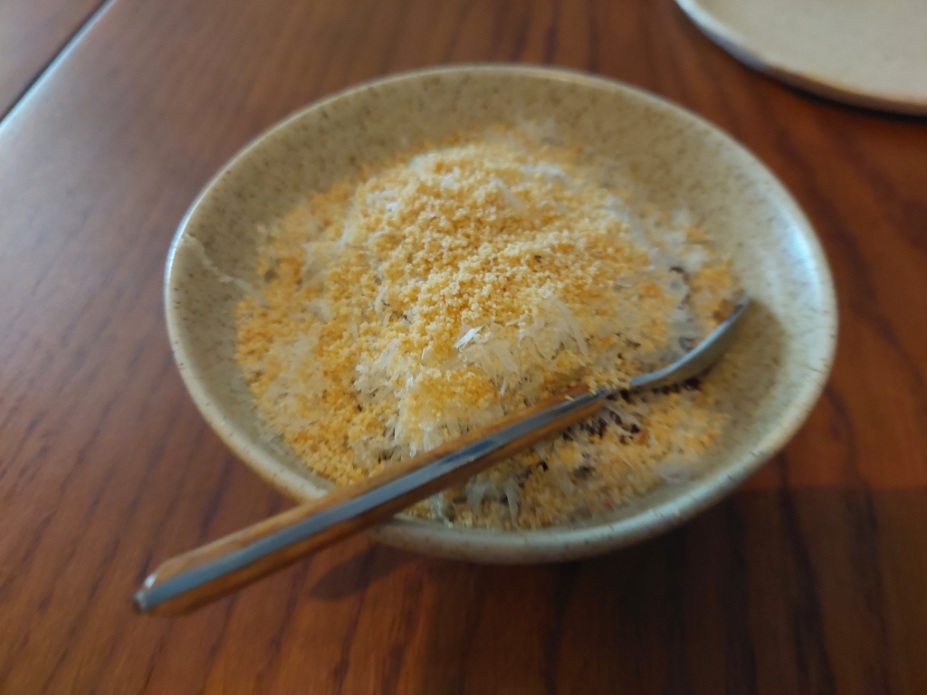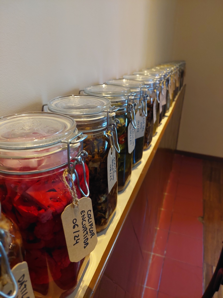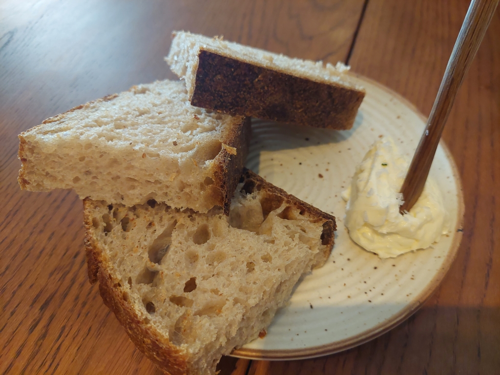 Son preparaciones en las que mezclan sabores, con tendencia por los encurtidos. La carta de vinos es corta y va de los 29€ por un Tanuki Bob 2021 (que se vende en tienda a 17€) o un Valautín Garnacha 2021 a 26€ (que se vende en tienda a 15€), lo que hace una estupenda RCP. El pan es lo único que no hacen ellos, lo traen de Panifiesto Lavapiés, y lo acompañán de una suave mantequilla.