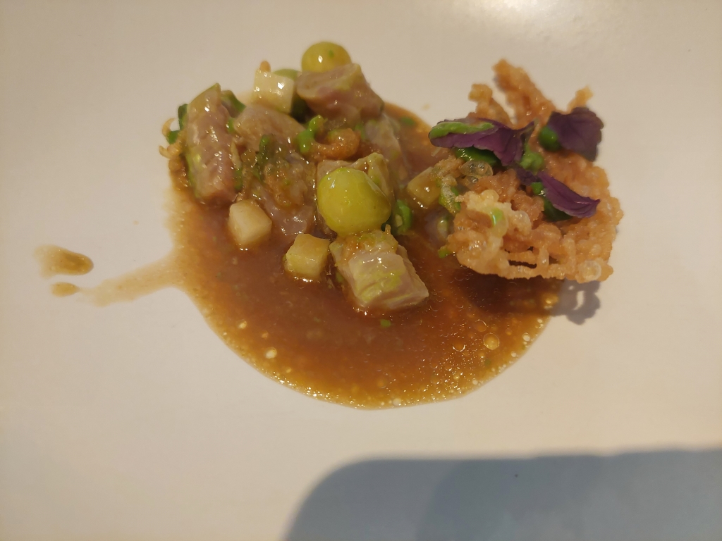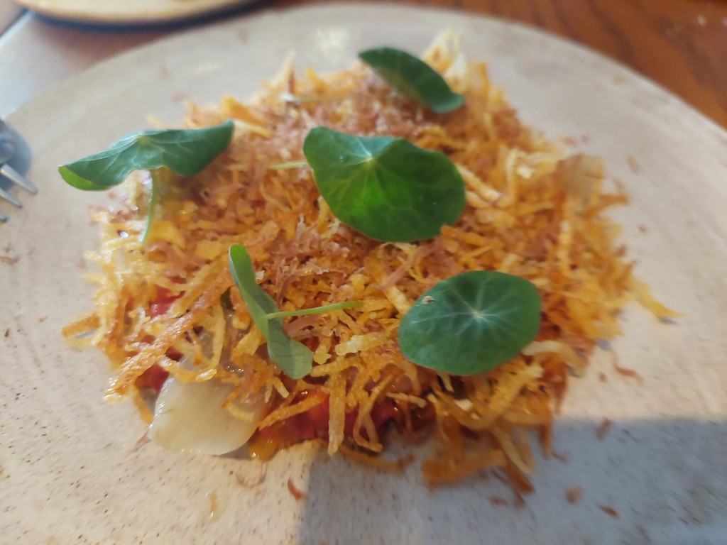 Pasamos al único plato de carne que pedimos, un tartar de vaca con pickles, cubierto de patatas paja, y con raspaduras de corazón curado. Es el plato que menos me gustó. Suelo pedir steak tartar y este tenía exceso de salsa y poco sabor en la carne, además las patatas paja no ayudaban al plato.