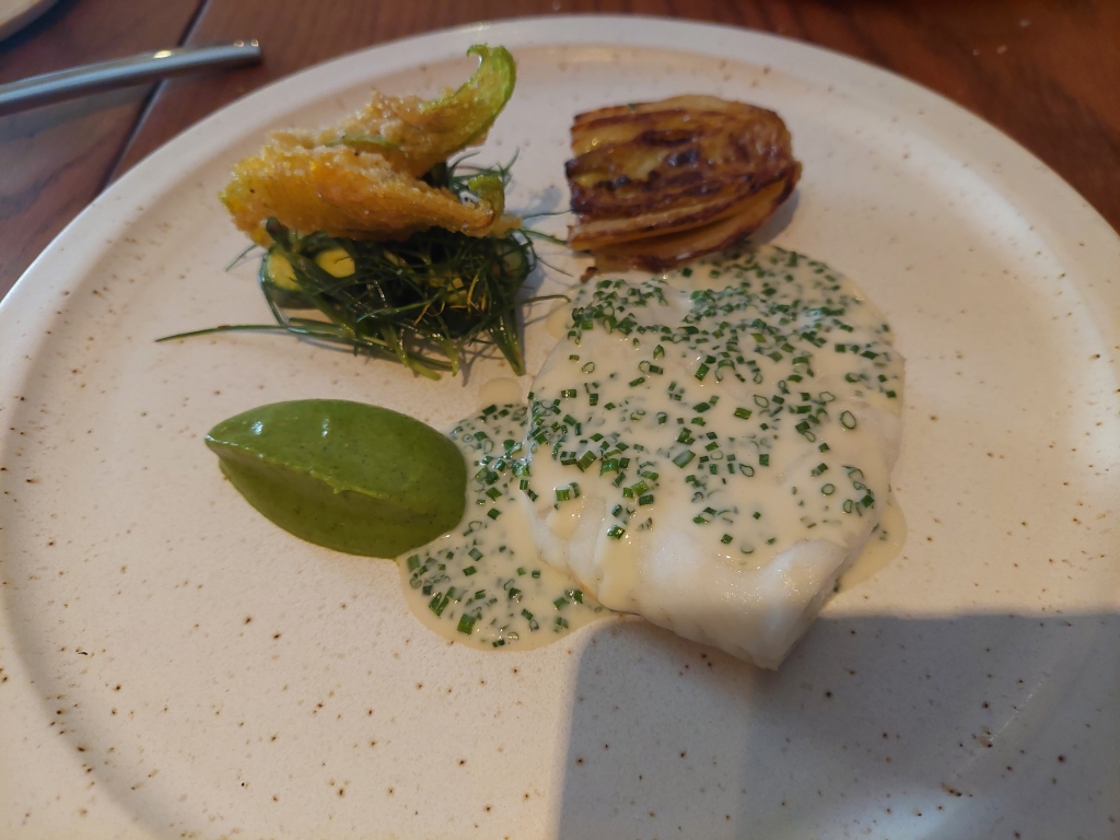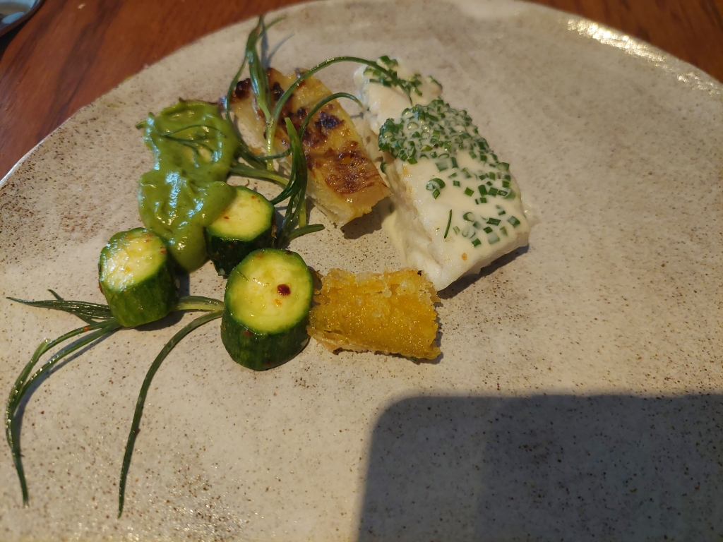Por último, coruxo (un pescado similar al rodaballo) con flor de calabacín frita e hinojo cubierto con una salsa emulsionada de las propias espinas del pescado e hinojo.