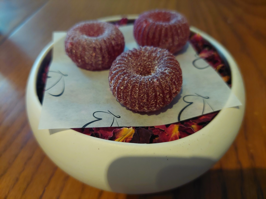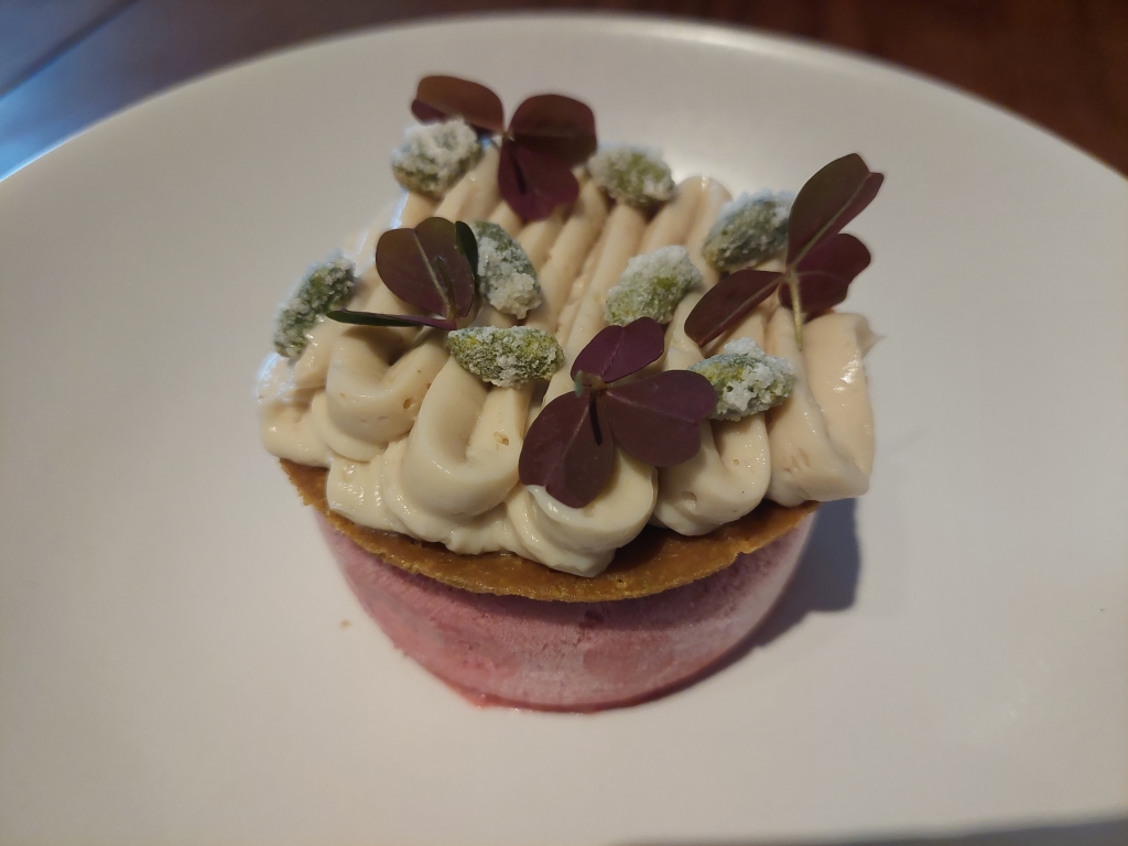 De postre una tartaleta de helado de cereza con crema aromatizada por haba tonka y pistacho. Riquísimo. Y unas gominolas de fruta caseras.