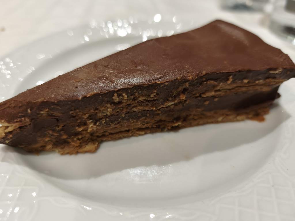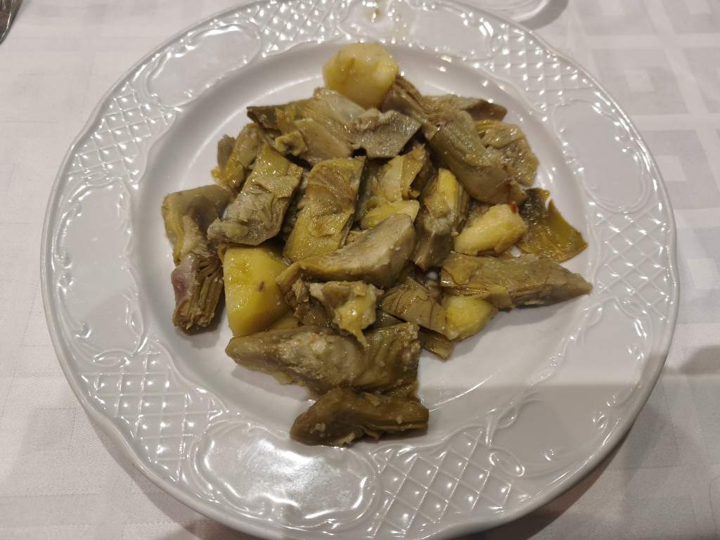Alcachofas rehogadas, merluza a la romana y tarta de chocolate.