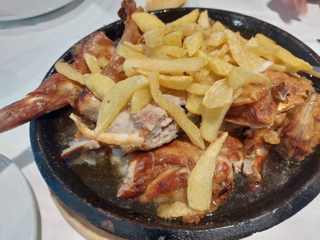 En CONDUMA, el lechazo asado es su especialidad. Pedimos dos cuartos para compartir entre cinco comensales. Sin fallos. En su punto.