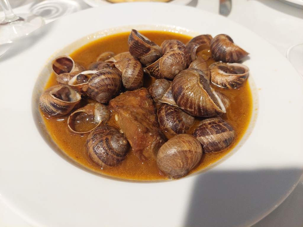 Comenzamos con unos caracoles para ir abriendo boca, quizá lo más flojo de la comida, faltos de picante, con lo que la salsa se queda en poca cosa.