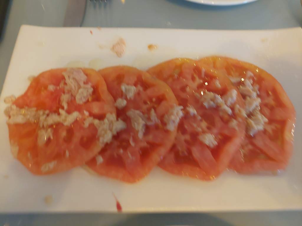 Aunque la foto deja mucho que desear, se puede apreciar lo que da de sí esta ensalada de tomate (a 7,5€). Un tomate nada especial y en una cantidad francamente lamentable.