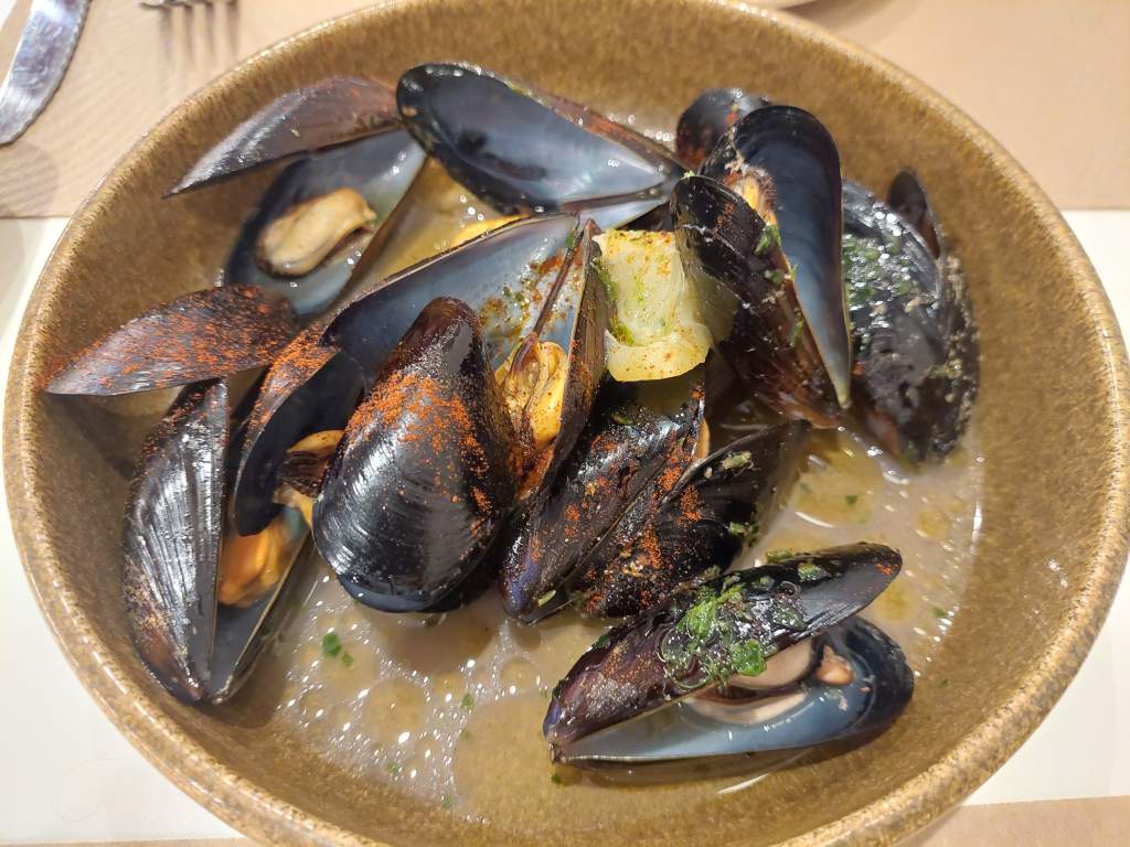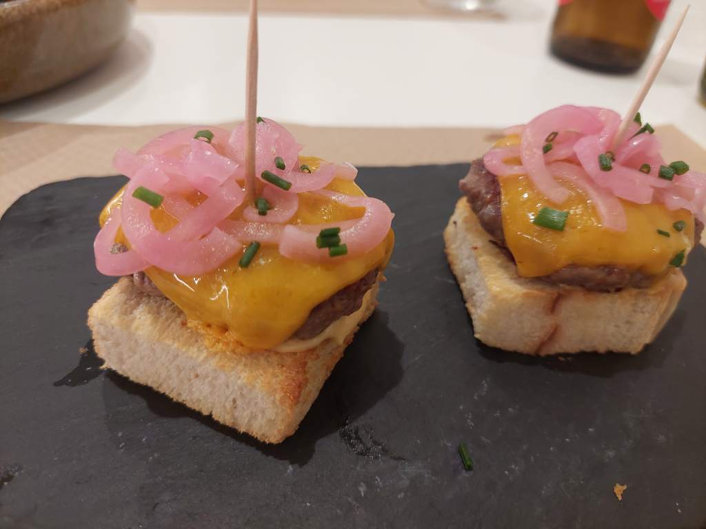 El menú comienza con unos entrantes a compartir: elegimos mejillones de roca y hamburguesitas.