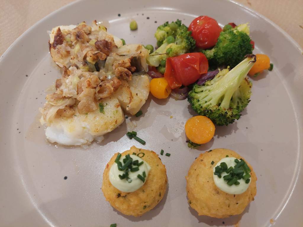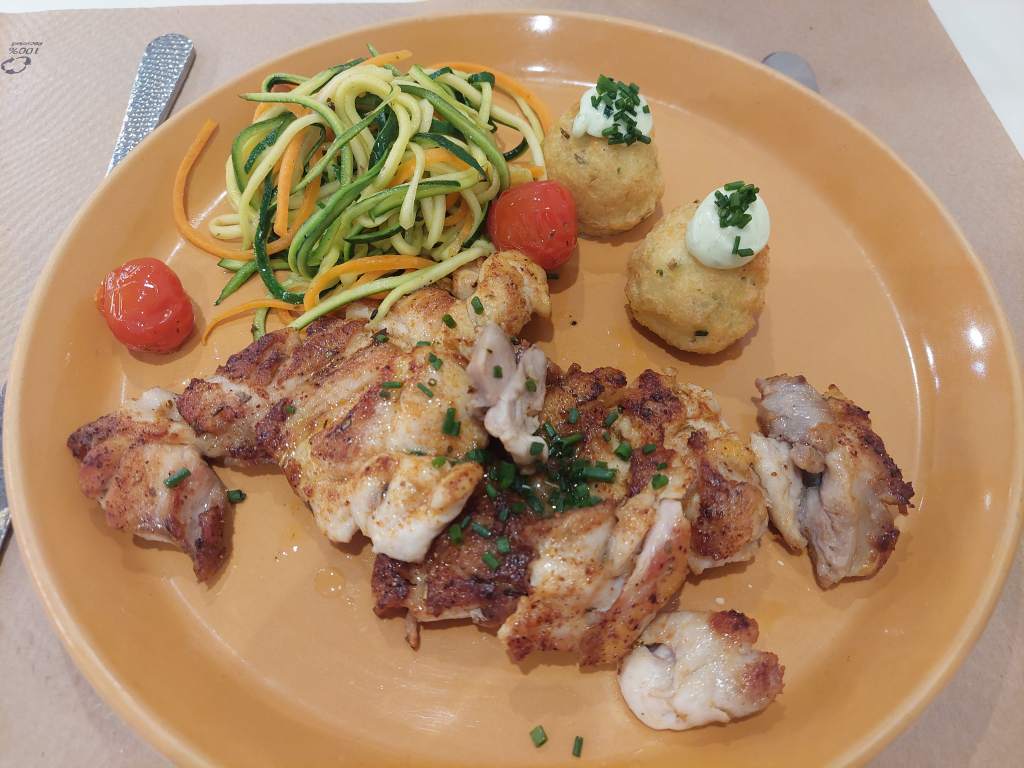 Los platos principales fueron: enterita de sepia a la plancha con guarnición, y muslo de pollo mediterráneo deshuesado.