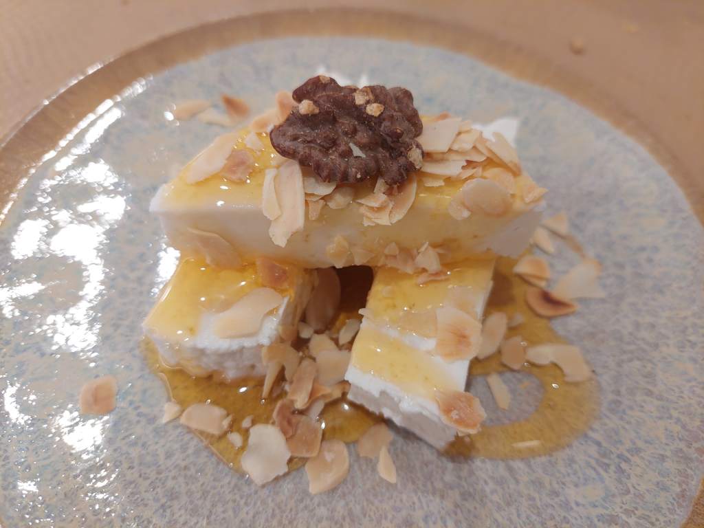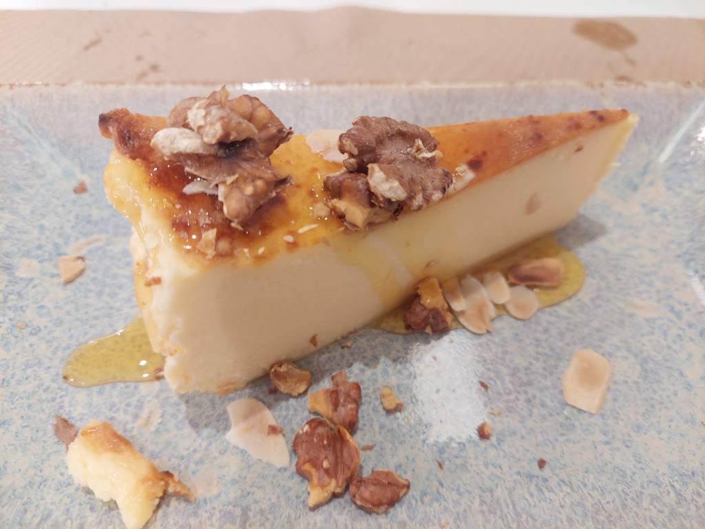 Los dos postres: cheesecake de queso de cabra con miel de azahar y nueces, y requesón de Benassal con miel y frutos secos.
