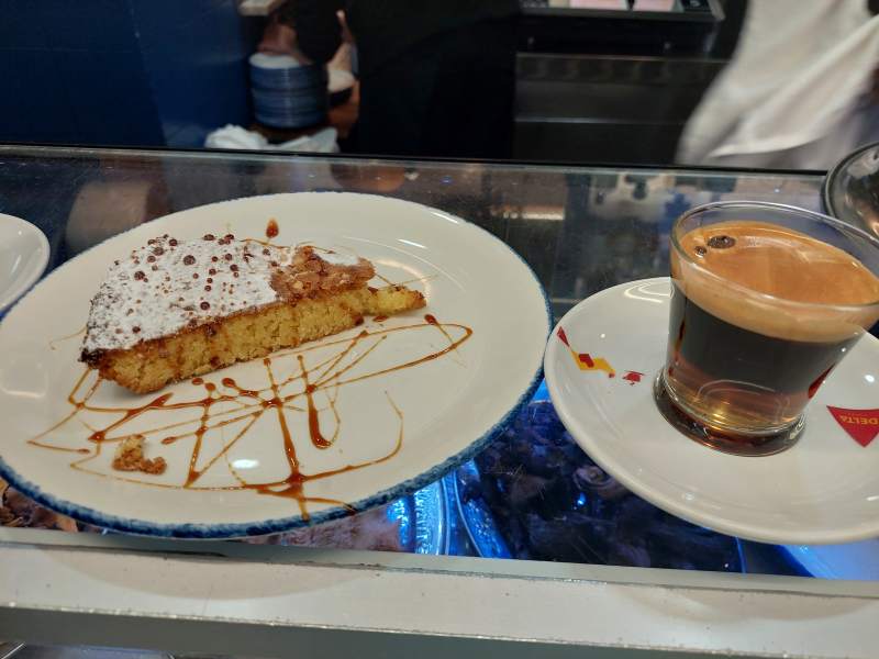 Una de las enseñas del local son sus carajillos. Lo acompañamos de una tarta de Santiago.