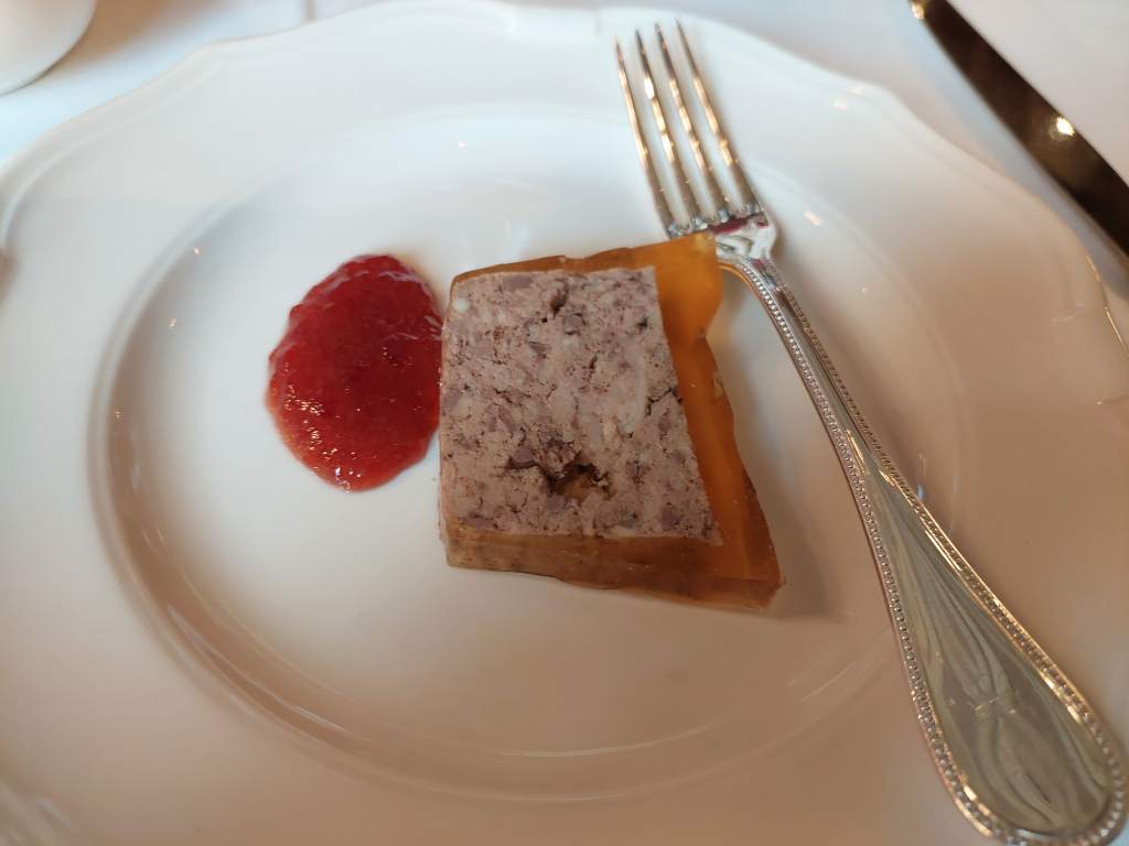 Comenzamos con el clásico aperitivo de la casa, pate de ave a la pimienta con una extraordinaria gelatina y mermelada de frambuesa.