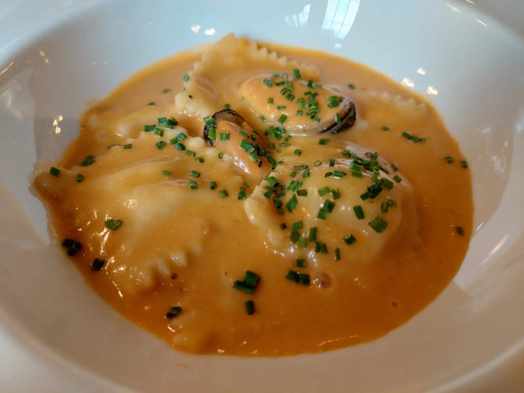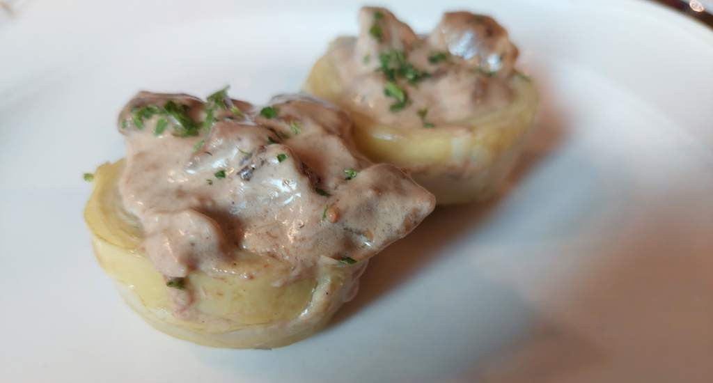 Dos entrantes, a cual mejor: alcachofas con setas y raviolis de rodaballo y gambas. Por supuesto, emplatado individualmente para cada comensal.