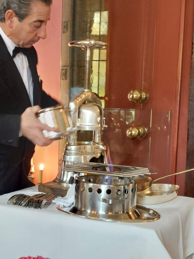 Pocas cosas más espectaculares que ver cómo manejan la prensa de plata para preparar la perdiz a la prensa.