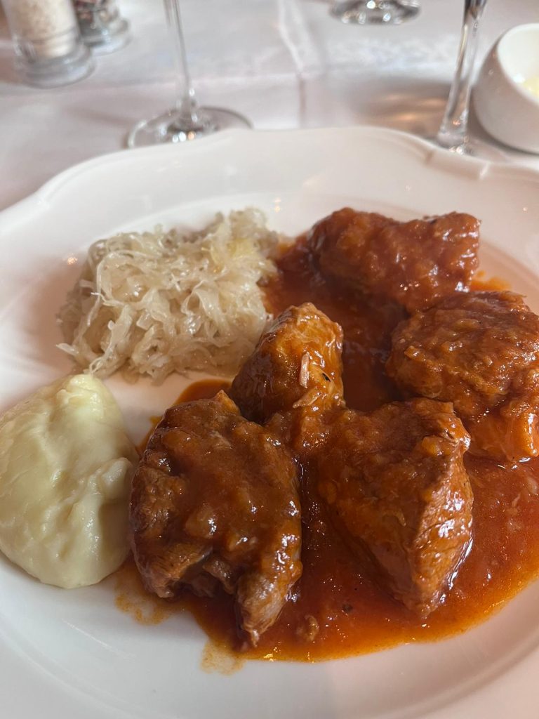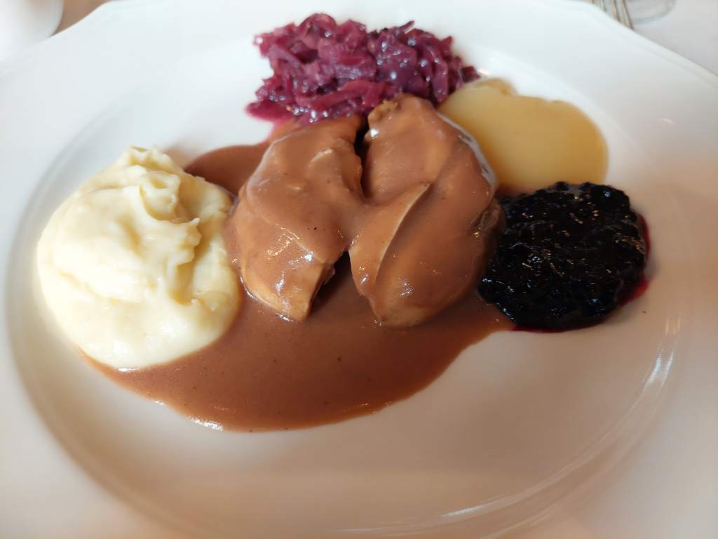 Y por último la calidad de su cocina, al frente de la cual está el cocinero Miguel Hermann. Cocina alemana de altísima calidad con especial acento en los platos de caza. La carta es corta y apenas cambia a lo largo de los años. Muchos platos son ya icónicos en el restaurante, como su perdiz a la prensa, que preparan delante del comensal en una prensa de plata de 10 kilos, el consomé don Víctor, en honor a Víctor de la Serna, elaborado con un solomillo entero prensado, crema, yema de huevo, oloroso de Jerez, sal y pimienta o su Baumkuchen.