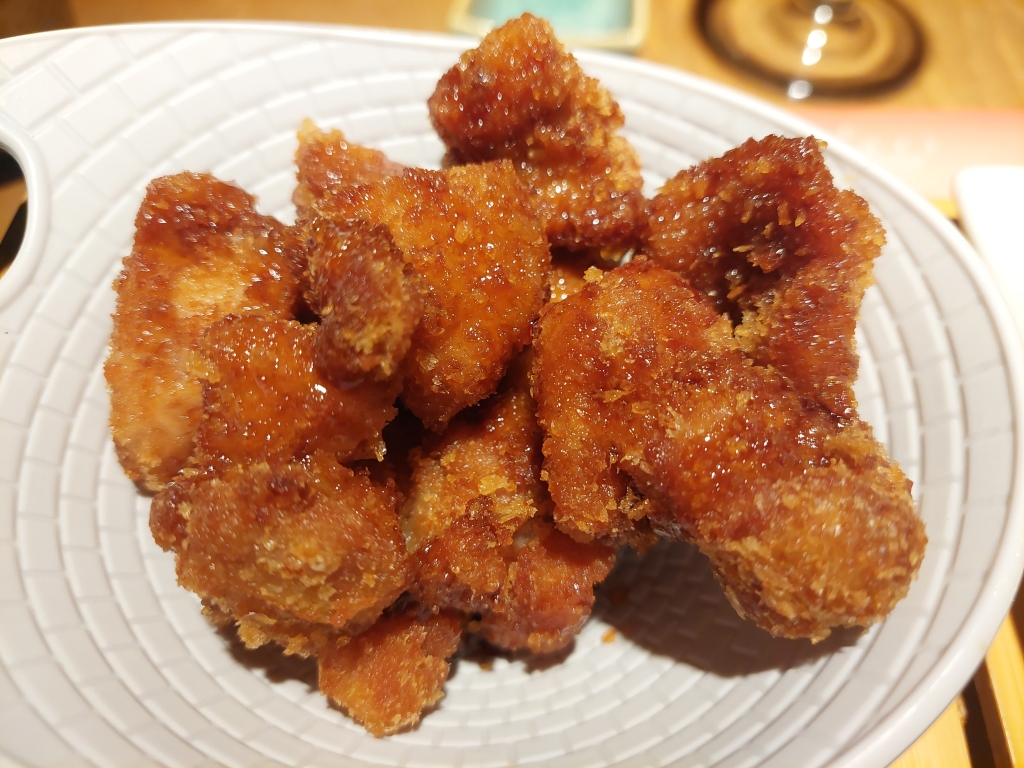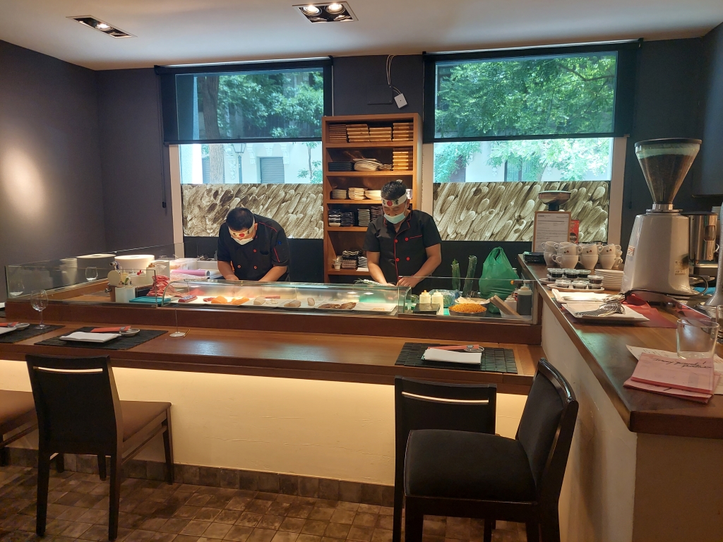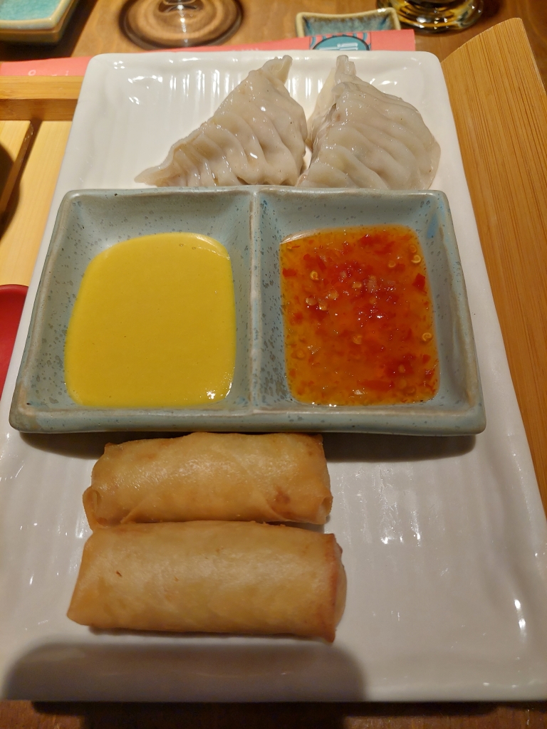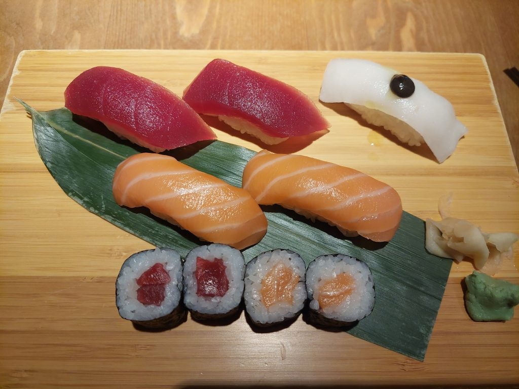aperitivos japoneses (pollo karaage, gyozas, rollitos Harumaki) y sushi (2 atún, 2 salmón, 1 pez mantequilla) y 4 makis (atún y salmón).