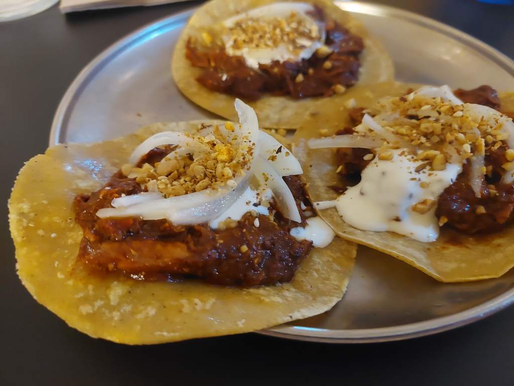 Taco de pollo al mole. Leo que el mole tiene entre sus ingredientes chocolate, plátano frito, chiles pasilla y guajillo. El taco viene rematado con dukkah, la mezcla egipcia de frutos secos y especias que aporta un toque diferente.
