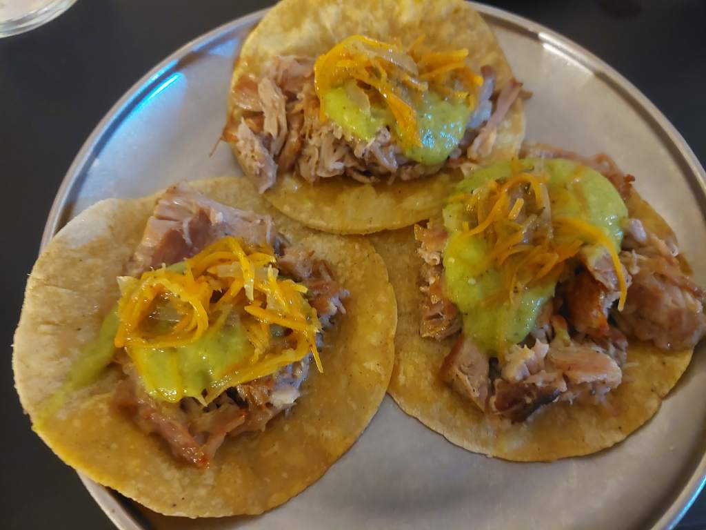 Tacos de carnitas: con escabeche y un “falso-guacamoles”, además de semilla de cilantro. Sabrosísimos.