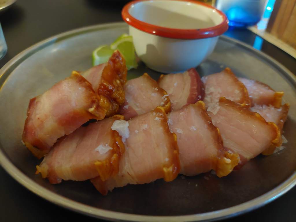 Comenzamos con unos torreznos “Paquita Salas” acompañados de limas y salsa vietnamita nuoc cham, que es una salsa de pescado fermentado, zumo de lima y chiles los picantes.
