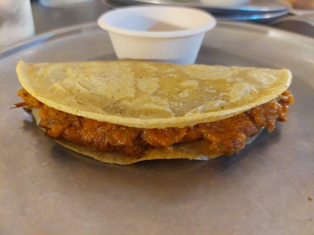 Taco de res. Viene con queso fundido y acompañado de una salsa de mango y chile rojo que es puro fuego.
