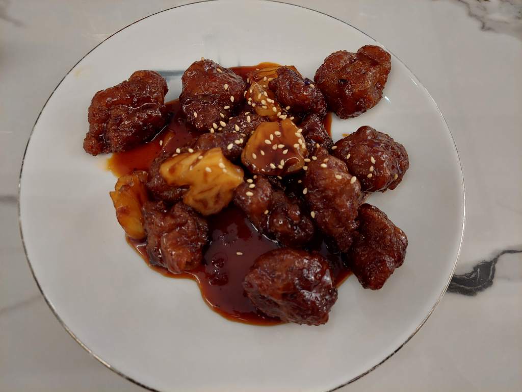 El principal, bolitas de cerdo agridulce cantonés, que no me ha gustado demasiado, y unos tallarines fritos que no han estado mal.