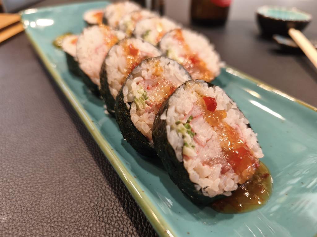 Tsunami roll: relleno de atún, kanikama (los palitos de cangrejo), pepino, cebollino y japo mayo. Demasiado basto y además con salsa sweet chilli por encima, lo que para mí es una tarjeta roja directa.