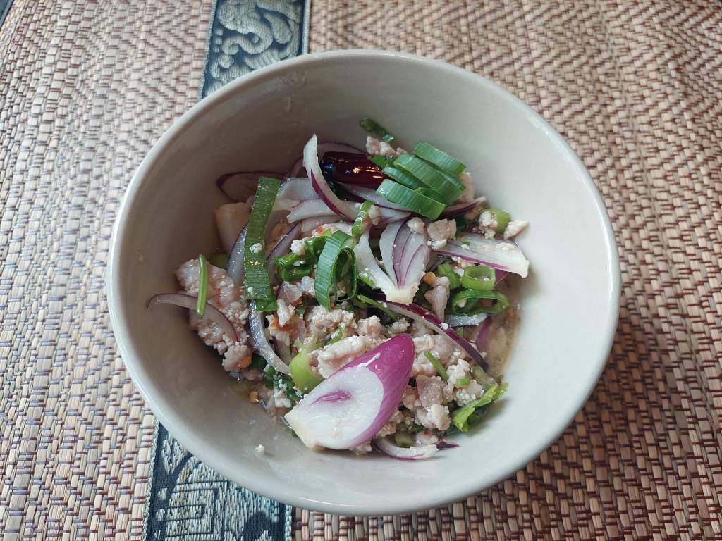 Comienzo el menú con Laab Moo, que es una ensalada picante de carne de cerdo picada originaria de la región noreste (Isaan) de Tailandia y Laos, que se condimenta con ingredientes como jugo de lima, salsa de pescado, chalotas y cilantro. Bastante intenso el sabor de las especias, no es para todos los gustos.